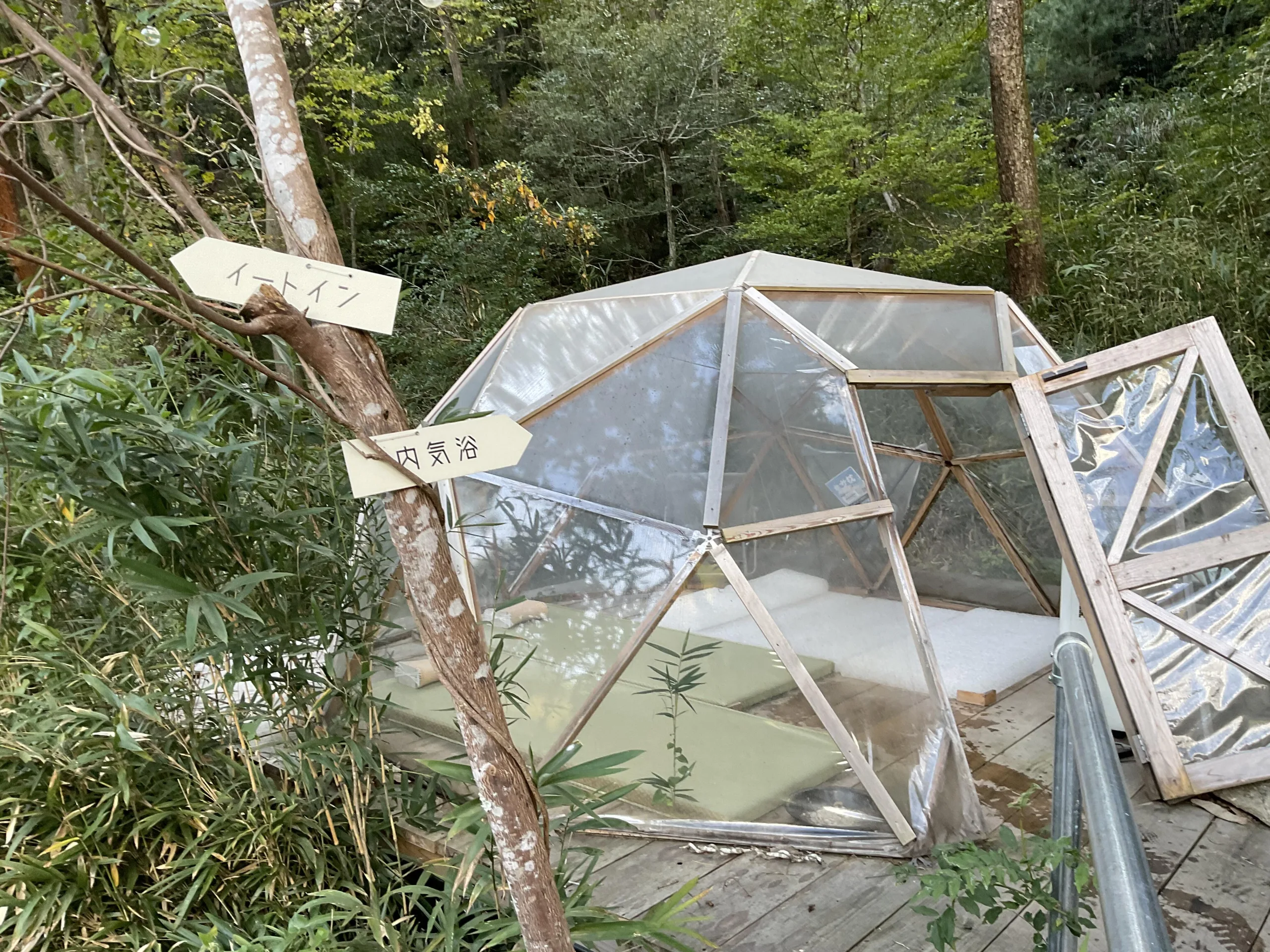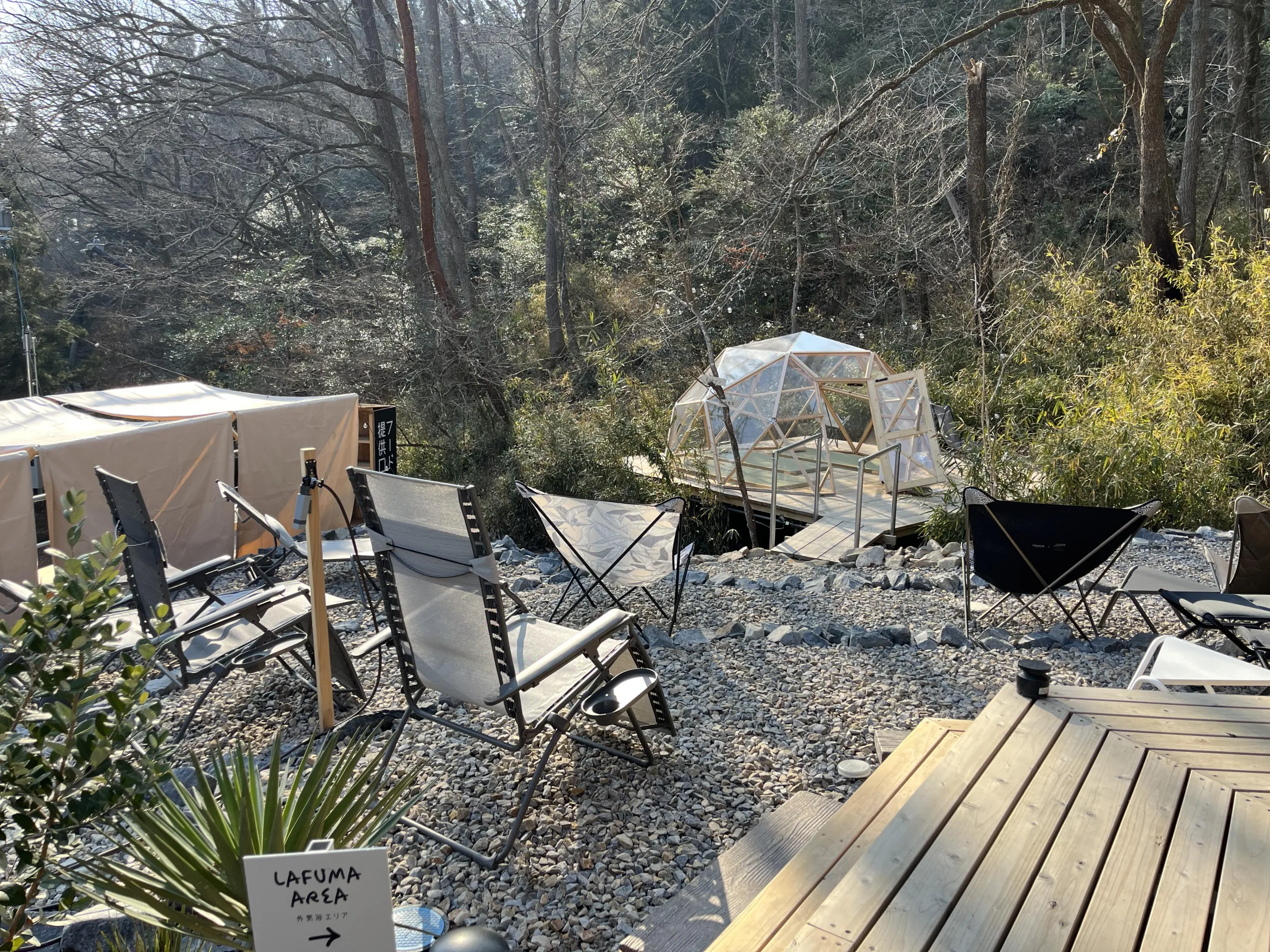 寒い時期でも自然を感じながらととのえる、快適なドーム型透明テントを設計。自然豊かな外気浴スペースのチェアは、フランス発のアウトドアチェア「ラフマ」。