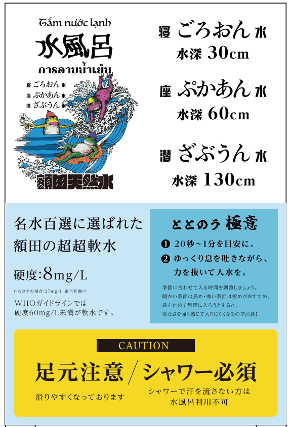 潜る・座る・寝る。水深の異なる3種の特注水風呂水風呂に使用している水は、施設近隣で採取できる、日本100名水にも選ばれた超軟水。水風呂は3種類あり、気分や好みに合わせて選べるようにしました。